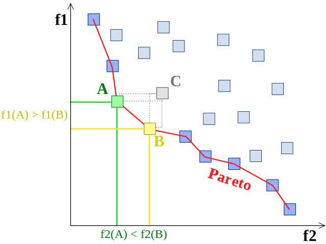 The points in the Pareto front attain an optimal trade-off between objectives in the sense that you cannot move from one point in the Pareto front to another arbitrary point by improving one of the objectives without deteriorating the other. The figure above shows an example of a Pareto front for two objectives f1 and f2. Each point in the plot shows the objective values obtained for a particular choice of the design parameters. When solving a multi-objective optimization problem we are interested in finding values of the design parameters that map to points in the Pareto front. Once we have found the points in the Pareto front, we can make a decision and choose one that satisfies our requirements.