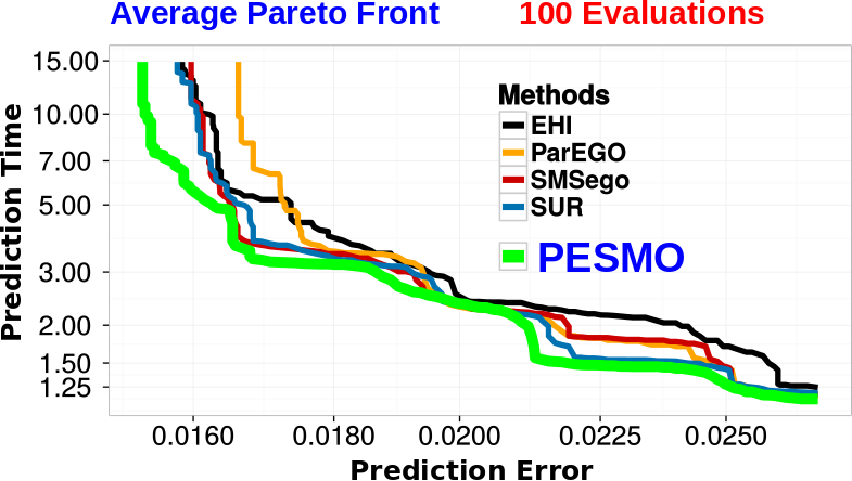 The script extract_recommendations.py stores the values of the design parameters that are estimated to be in the Pareto front in the file pareto_front.txt. We can then evaluate the objectives at the recommended points using the script evaluate_objectives.py and choose the one that best fits our requirements. The following figure shows the average Pareto front obtained with PESMO and with other existing BO methods over 50 repetitions of the optimization process. Overall, PESMO is able to find neural networks with better trade-offs between prediction accuracy and prediction speed than the alternative techniques. By visualizing the Pareto front, as shown in the figure, we can also make better decisions regarding which points from the Pareto front we would like to choose.